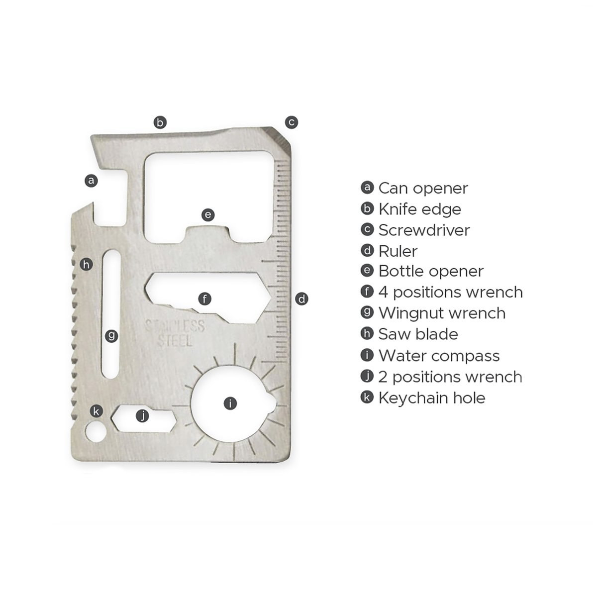 Multitool mit widerstandsfähigem Edelstahlgehäuse mit 11 Funktionen. Mit Dosenöffner, Messer, Schraubendreher, Lineal, Flaschenöffner, Flaschenöffner, Schraubenschlüssel, Flügelschlüssel, Säge und Richtungsanzeiger. Präsentiert in einem widerstandsfähigen