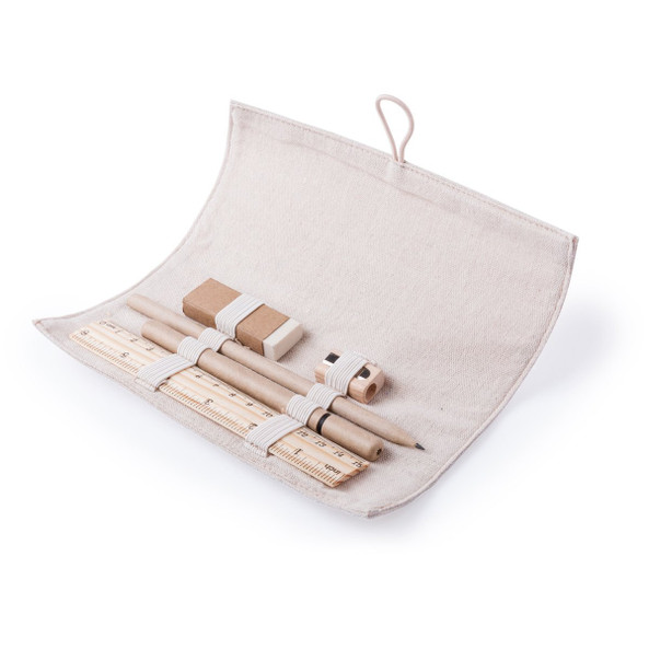 Set mit Bambuslineal, Bleistift auf Papier, Kugelschreiber auf Karton, Spitzer aus Holz und Radiergummi. Wird mit einem Etui aus Baumwolle und Jute geliefert.