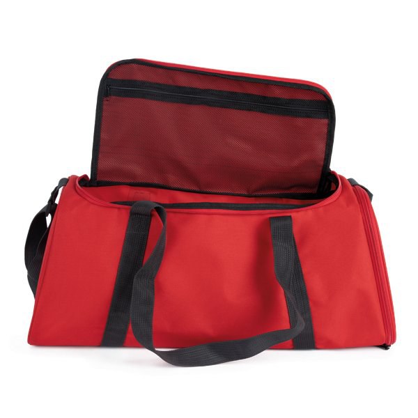 100% Polyester Sporttasche mit großer Öffnung oben und Zweiwege-Reißverschluss.